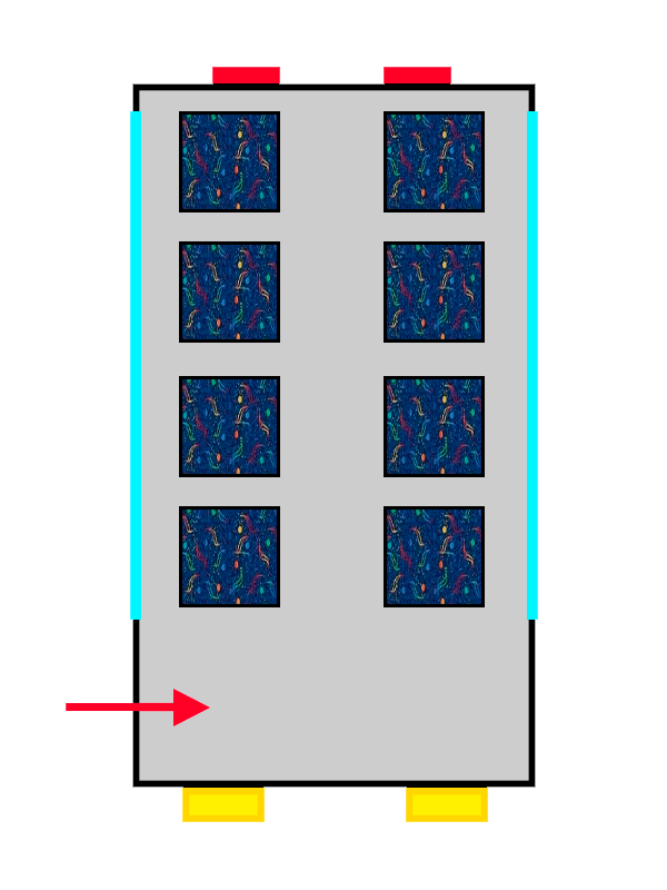 A bus with ALSA-style upholstery gradually filling up with people represented by arrows.