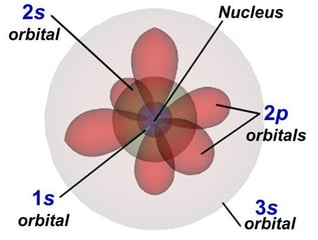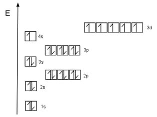Los 4 primeros orbitales de un átomo: 1s, 2s, 2p, 3s. Los números representan "el piso", y la letra, su forma.
