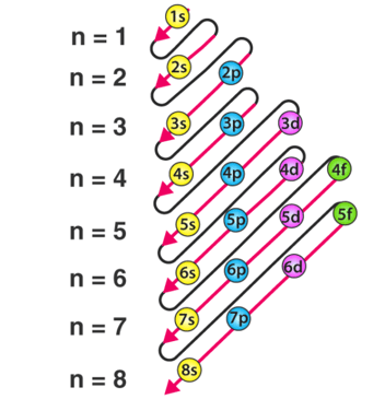Orden de llenado de los pisos, siguiendo la línea serpenteante. Fuente: https://byjus.com/chemistry/aufbau-principle/