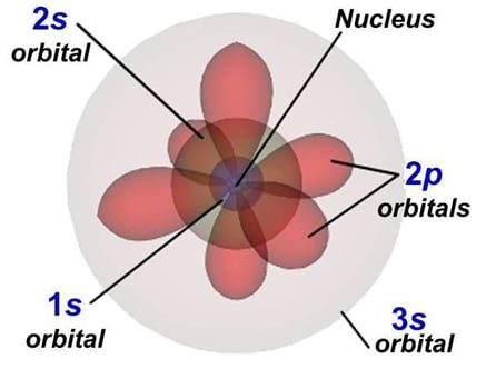 Los orbitales que llamamos s son esféricos, son los 2 de color gris en la imagen, mientras que los que llamamos p tienen forma de infinito y son los 3 de color rojo en la imagen.