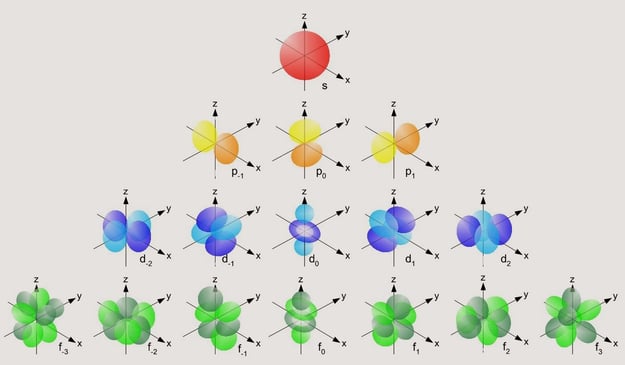 Representación de la forma de los orbitales de cada piso. Fuente: https://elfisicoloco.blogspot.com/2013/12/formas-de-los-orbitales-atomicos.html